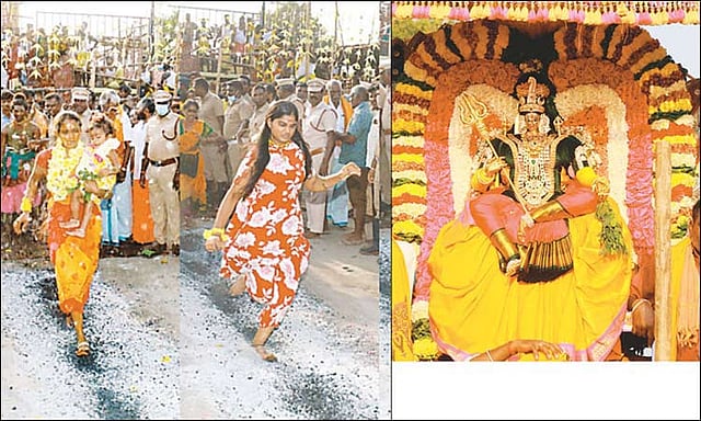 பின்பு மேளதாளம் முழங்க ஊர்வலமாக வந்து மாலை 4 மணிக்கு கோவிலுக்கு முன்பு இருந்த அக்னி குண்டத்தின் முன்பாக அம்மன் எழுந்தருளினார்.