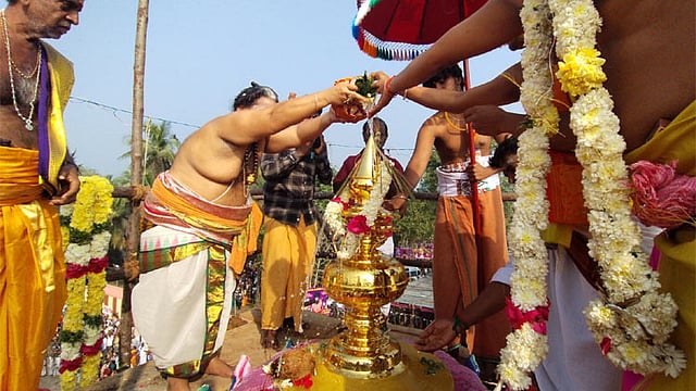 கும்பாபிஷேகத்தை முன்னிட்டு கடந்த 23ஆம் தேதி பூர்வாங்க பூஜையும், 27ஆம் தேதி முதல் யாகசாலை பூஜைகளும் நடைபெற்றன. இன்று காலை 6ம் கால யாகசாலை பூஜை நிறைவடைந்து பூர்ணாஹுதி மற்றும் மகா தீபாராதனை நடந்தது. அதன்பின்னர், காலை 8 மணிக்கு யாகசாலையில் இருந்து கடம்புறப்பாடு நடைபெற்றது. புனித நீர் குடங்களுடன் கோவிலை வலம் வந்து ராஜகோபுரம், சுவாமி, அம்பாள் மற்றும் பஞ்சமூர்த்திகள் சன்னதி விமானங்களை அடைந்தனர்.