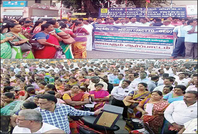 ஜாக்டோ-ஜியோ கூட்டமைப்பின் தர்மபுரி மாவட்ட பிரிவு சார்பில் தர்மபுரி தொலைபேசி நிலையம் முன்பு நேற்று மாலை ஆர்ப்பாட்டம் நடைபெற்றது. ஆர்ப்பாட்டத்திற்கு தமிழ்நாடு ஆசிரியர் முன்னேற்ற சங்க மாவட்ட தலைவர் கவுரன் தலைமை தாங்கினார். தமிழ்நாடு அரசு ஊழியர் சங்க மாவட்ட தலைவர் சுருளிநாதன், மாவட்ட செயலாளர் சேகர், கூட்டமைப்பு நிர்வாகிகள் ரத்தினம், ஆனந்தன், பாஸ்கரன், பழனி உள்ளிட்டோர் கோரிக்கைகளை விளக்கி பேசினார்கள். ஆர்ப்பாட்டத்தில் கோஷங்கள் எழுப்பப்பட்டன. இதில் அரசு பள்ளி ஆசிரிய, ஆசிரியைகள் அரசின் பல்வேறு துறைகளை சேர்ந்த ஊழியர்கள் திரளாக கலந்து கொண்டனர்.