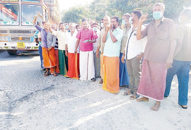 இந்தநிலையில் சாலையை சீரமைக்க வலியுறுத்தி தி.மு.க. சார்பில் நேற்று காலையில் நூதன போராட்டம் நடைபெற்றது. அதாவது தி.மு.க. வினர் சங்கு ஊதி நூதன முறையில் எதிர்ப்பை தெரிவித்தனர். ஆட்டோ டிரைவர்கள் முக கவசம் அணிந்து போராட்டத்தில் கலந்து கொண்டனர். மேலும் சாலையை சீரமைக்கக்கோரி கோஷங்கள் எழுப்பினர்.