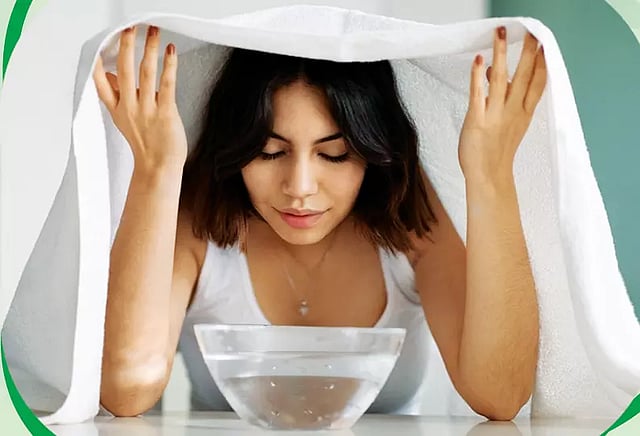 1. முதலில் ஒரு ரப்பர் பேண்டு கொண்டு தலைமுடியை நன்றாகக் கட்டுங்கள். முகத்தை மென்மையான சோப்பு கொண்டு கழுவுங்கள். ஒரு அகலமான கிண்ணத்தில் 5 முதல் 6 கப் வரை கொதிக்கும் தண்ணீரை எடுத்துக்கொள்ளுங்கள். தண்ணீரில் இருந்து உருவாகும் நீராவி உங்கள் முகத்தில் படும்படி உட்காருங்கள். இப்போது நீளமான டர்க்கி டவலைக் கொண்டு நீராவி வெளியே செல்லாதவாறு உங்களையும், கிண்ணத்தையும் சேர்த்து போர்த்திக்கொள்ளுங்கள். இவ்வாறு 5 முதல் 10 நிமிடங்கள் வரை முகம் முழுவதும் நீராவி படுமாறு செய்யுங்கள்.