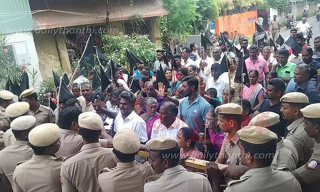 இந்தநிலையில் இன்று தந்திராயன்குப்பம் மீனவ பஞ்சாயத்து நிர்வாகிகள் தலைமையில் மீனவர்கள் வீடுகளில் கருப்புக்கொடி ஏந்தி போராட்டத்தில் ஈடுபட்டனர். பின்னர் தந்திராயன்குப்பம் ஊருக்குள் மறியலில் ஈடுபட்டனர்.