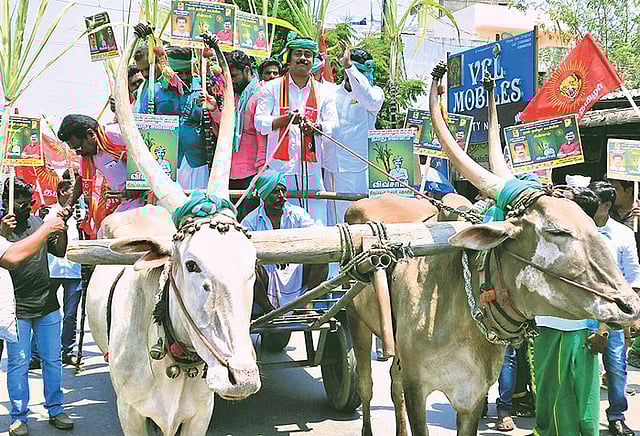 காஞ்சீபுரம்(தனி) நாடாளுமன்ற தொகுதியில் நாம் தமிழர் கட்சி வேட்பாளராக போட்டியிடும் சிவரஞ்சனி மாட்டு வண்டியில் காஞ்சீபுரம் கலெக்டர் அலுவலகத்திற்கு வந்து வேட்புமனு தாக்கல் செய்தார்.