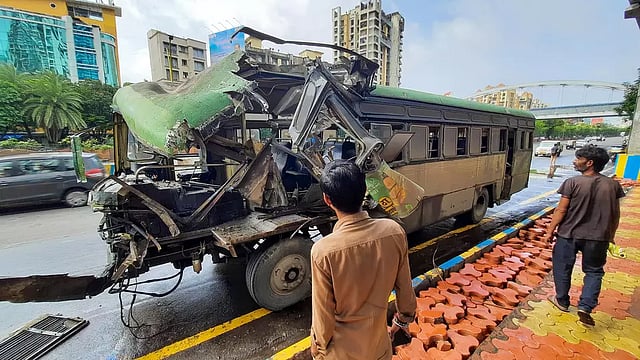 தானேயில் இருந்து மும்பை போரிவிலி நோக்கி அரசு பஸ் ஒன்று நேற்று காலை 6 மணி அளவில் சென்றது. இந்த பஸ்சில் 4 பெண்கள் உள்பட 9 பயணிகள் இருந்தனர். மும்பை-நாசிக் நெடுஞ்சாலையில் வந்த போது முன்னால் சென்ற கன்டெய்னர் லாரி மீது அரசு பஸ் மோதி விபத்து ஏற்பட்டது. இதனால் பஸ்சின் முன்பகுதி சேதமடைந்ததது. பஸ்சில் இருந்த 41 வயது பெண் பயணி மற்றும் நடத்துனர் ஆகியோர் பலத்த காயமடைந்தனர். விபத்து நடந்த உடனே கன்டெய்னர் லாரி டிரைவர் அங்கிருந்து தப்பி சென்று விட்டார். நடுரோட்டில் நடந்த விபத்தினால் அங்கு போக்குவரத்து நெரிசல் ஏற்பட்டது. தகவல் அறிந்த மீட்பு படையினர் சம்பவ இடத்திற்கு சென்று பெண் பயணி, நடத்துனரை மீட்டு கல்வா சிவில் ஆஸ்பத்திரிக்கு அனுப்பி வைத்தனர். அங்கு அவர்களுக்கு சிகிச்சை அளிக்கப்பட்டு வருகிறது. இது குறித்து காப்பூர்பாவடி போலீசார் வழக்கு பதிவு செய்து விசாரணை நடத்தி வருகின்றனர். மேலும் தப்பிச்சென்ற டிரைவரையும் தேடி வரைகின்றனர்.