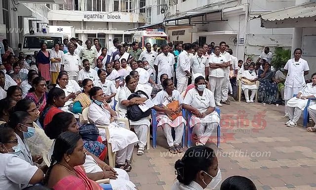 இந்தநிலையில் அனைத்து மருத்துவ நிறுவனங்களில் பணி செய்யும் ஊழியர்கள் இன்று காலை 8 மணி முதல் 10 மணி வரை வெளிநடப்பு செய்து போராட்டம் நடத்தினர். இதில் செவிலியர்கள், மருந்தாளுனர், வார்டு அட்டெண்டர், உதவியாளர் உள்பட அனைத்து பிரிவு ஊழியர்களும் கலந்துகொண்டனர்.