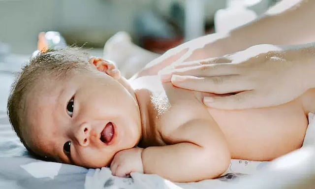 இறுதியில் குப்புற படுக்கவைத்து விரல் நுனிகளால் குழந்தையின் முதுகெலும்புகளை மேலிருந்து கீழாக மெதுவாக நீவி விட வேண்டும்.