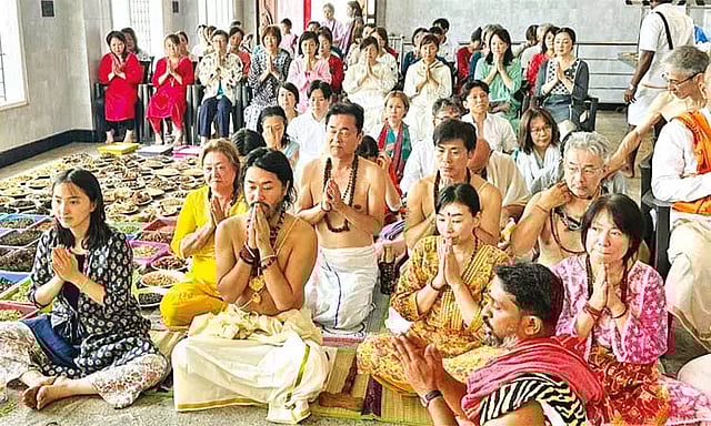 பின்னர் கோவிலின் எதிரே உள்ள ஒரு மடத்தில் உலக நன்மைக்காகவும், நல்ல மழை பெய்து விவசாயம் செழிக்க வேண்டியும் சிறப்பு யாக பூஜை நடத்தினர். தொடர்ந்து புனிதநீர் அடங்கிய கலசங்களுடன் ஜப்பான் நாட்டினர் கோவிலுக்கு சென்று சாமி, அம்பாளை தரிசனம் செய்தனர். பின்னர் கோவிலில் 3-ம் பிரகார தூண்களின் அழகையும் கண்டு ரசித்தனர்.