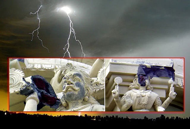 சேலம் மாவட்டம், ஓமலூரை அடுத்த கஞ்சநாயக்கன்பட்டி ஊராட்சி ராக்கிப்பட்டியில் 300-க்கும் மேற்பட்ட குடும்பத்தினர் வசித்து வருகின்றனர். கடந்த ஒரு ஆண்டுக்கு முன்பு இந்த ஊரில் பெரியாண்டிச்சியம்மனுக்கு புதிதாக கோவில் கட்டப்பட்டு மகா கும்பாபிஷேகம் நடைபெற்றது. இந்த நிலையில் காடையாம்பட்டி, ஓமலூர் சுற்றுவட்டார பகுதிகளில் நேற்று முன்தினம் இரவு இடியுடன் பலத்த மழை பெய்தது. அப்போது ராக்கிப்பட்டி பெரியாண்டிச்சியம்மன் கோவில் கோபுரம் மீது மின்னல் தாக்கியது. இதில் கோபுரத்தில் இருந்த 4 சாமி சிலைகள் சேதம் அடைந்தன.