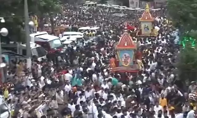 மத்திய உள்துறை மந்திரி அமித் ஷா மங்கல ஆரத்தி எடுத்து வழிபாடு செய்தார். குஜராத் முதல்வர் பூபேந்திர படேல், பாரம்பரிய வழக்கப்படி தங்க துடைப்பத்தால் ரதம் செல்லும் தெருவை சுத்தம் செய்தார். தேர்கள் செல்லும் ஊர்வல பாதையில் பல்லாயிரக்கணக்கான பக்தர்கள் திரண்டு தரிசனம் செய்தனர். இந்த ஊர்வலம் நகரின் பல்வேறு பகுதிகளைக் கடந்து இரவு 8 மணியளவில் கோவிலுக்கு திரும்பும். ரத யாத்திரையை முன்னிட்டு விரிவான பாதுகாப்பு ஏற்பாடுகள் செய்யப்பட்டுள்ளன.