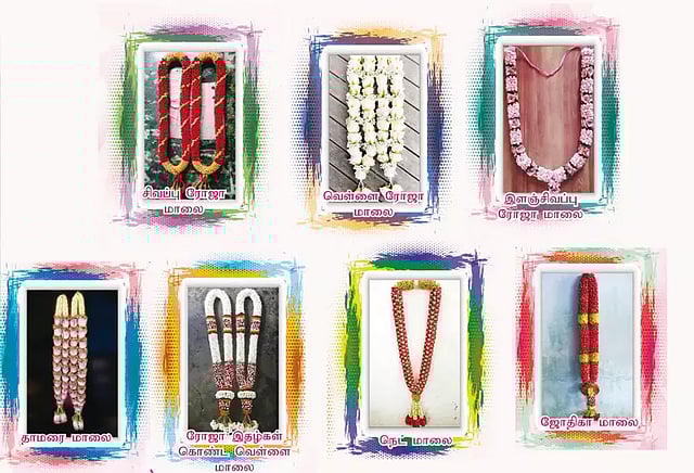 தங்க நிறம், மாம்பழ நிறம் மற்றும் ஆரஞ்சு நிற பட்டுப் புடவை அணியும்போது, சிவப்பு நிற பெரிய ரோஜா மற்றும் ஜிப்ஸி மலர்களை கோர்த்து நேர்த்தியாக வடிவமைக்கப்பட்ட மாலைகளை அணிந்தால் பொருத்தமாக இருக்கும்.