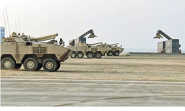 அபுதாபி யாஸ் தீவில் அடுத்த மாதம் (நவம்பர்) 5-ந் தேதி நடக்கும் ராணுவ காட்சிக்காக பீரங்கி, ராணுவ ஹெலிகாப்டர்களுடன் ராணுவ பாதுகாப்பு ஒத்திகை நேற்று தீவிரமாக நடந்தது.