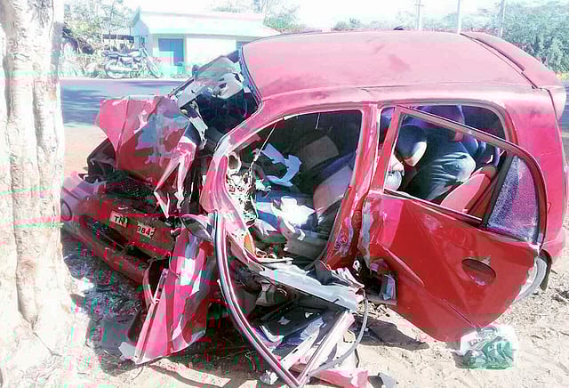 நேற்று அதிகாலை 5 மணி அளவில் ஆறுமுகநேரி அருகே முக்காணி வடபுறம் கார் வந்த போது திடீரென்று டிரைவரது கட்டுப்பாட்டை இழந்து ஓடியது. அங்குள்ள இசக்கி அம்மன் கோவில் அருகில் சாலையோரம் நின்ற மரத்தில் கார் பயங்கரமாக மோதியது.