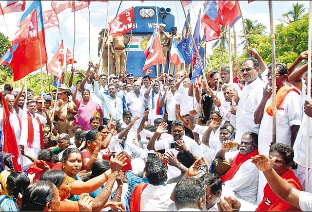 இந்த நிலையில் ரெயிலை மறிப்பதற்காக மத்திய- மாநில அரசுகளை கண்டித்து கோஷம் எழுப்பியபடி வந்த போராட்டக்காரர்களை தடுத்து நிறுத்தி போலீசார் அவர்களை கைது செய்தனர்.