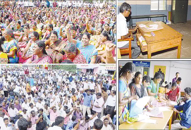 3 ஆயிரத்து 500 தொடக்க பள்ளிகளை உயர்நிலை, மேல்நிலைப்பள்ளிகளுடன் இணைக்கும் முடிவினையும், 3 ஆயிரம் சத்துணவு மையங்களை மூடும் முடிவினையும் ரத்து செய்ய வேண்டும். அங்கன்வாடி மையங்களில் எல்.கே.ஜி., யு.கே.ஜி. வகுப்புகளில் இடைநிலை ஆசிரியர்களை பணியமர்த்தப்படுவதை அரசு கைவிட வேண்டும் என்பன உள்ளிட்ட 9 அம்ச கோரிக்கைகளை நிறைவேற்ற வலியுறுத்தி தமிழ்நாடு அரசு ஊழியர்கள் மற்றும் ஆசிரியர்களின் சங்கங்களின் கூட்டமைப்பான பெரம்பலூர் மாவட்ட ஜாக்டோ- ஜியோவினர் கடந்த 22-ந் தேதி வேலை நிறுத்த போராட்டத்தை தொடங்கினர்.