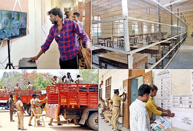 அதன்பின்னர் அங்கிருந்து போலீஸ் வேன்களில் மின்னணு வாக்குப்பதிவு எந்திரங்கள் மற்றும் தேர்தல் பொருட்களை ஏற்றிக் கொண்டு போலீசார் அந்தந்த வாக்குச்சாவடிகளுக்கு சென்றனர். ஒவ்வொரு வேனிலும் துப்பாக்கி ஏந்திய போலீசாரும் சென்றனர்.