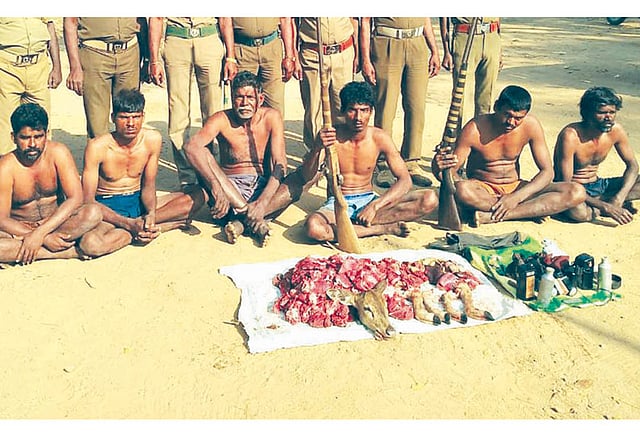 காவேரிப்பள்ளம் என்ற இடத்தில் சென்றபோது 6 பேர் கொண்ட கும்பல், 2 நாட்டுத்துப்பாக்கிகளுடன் சென்றது. இதைப் பார்த்த வனத்துறையினர் அவர்களை சுற்றி வளைத்து பிடித்தனர். அப்போது அவர்களிடம் 50 கிலோ மான் இறைச்சி இருந்தது கண்டுபிடிக்கப்பட்டது.