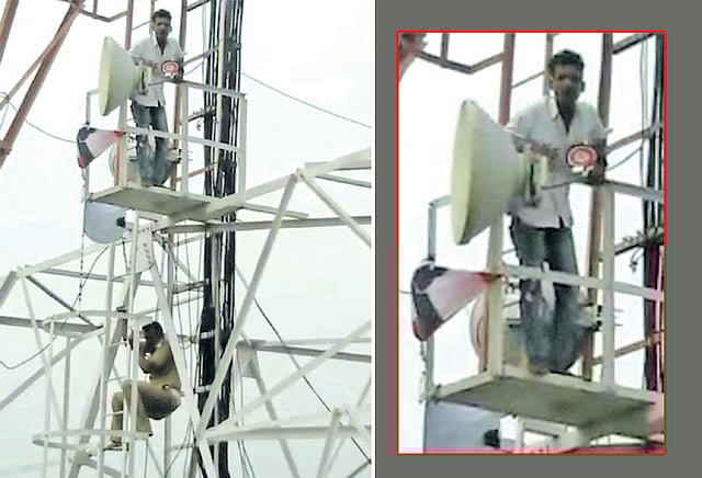 சென்னை ராஜா அண்ணாமலைபுரம் ஆர்.கே.மடம் சாலையில் பி.எஸ்.என்.எல். அலுவலகம் உள்ளது. நேற்று காலை இந்த செல்போன் கோபுரத்தில் வாலிபர் ஒருவர் ஏறினார். அவருடைய கையில் அம்மா மக்கள் முன்னேற்ற கழக கொடி இருந்தது.