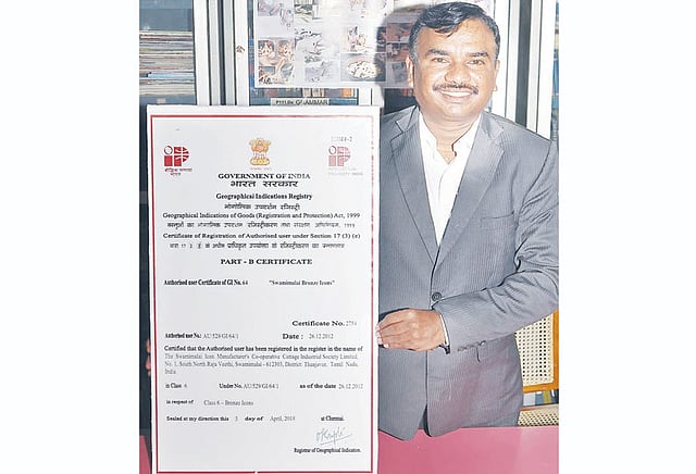 தொடர் முயற்சியின் காரணமாக மத்திய அரசின் தொழில் துறை வர்த்தக அமைச்சகத்தின் பதிவாளர் ஓ.பி.குப்தா, சுவாமிமலையில் தயார் செய்யப்படும் உலோக சிலைகளுக்கு புவிசார் குறியீடுக்கான தனி முத்திரை அடையாளத்திற்குரிய அங்கீகரிக்கப்பட்ட சான்றிதழை வழங்கியுள்ளார்.