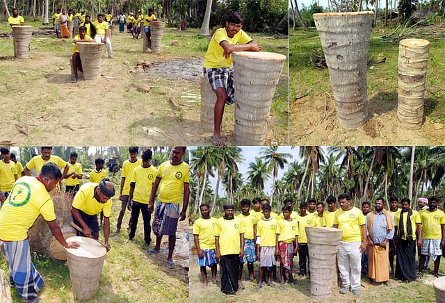 மேலும் அக்குழுவினர் எந்திரம் மூலம் அறுத்து அகற்றும் தென்னை மரங்களின் அடிப்பகுதியை டிராக்டர் போன்ற வாகனங்களில் ஏற்ற முடியாமல் சிரமப்பட்டனர். இதனால் யோசித்த அவர்கள், தென்னை மரங்களின் அடிப்பகுதியை மேஜை, இருக்கையாக செய்ய முடிவு செய்தனர். இதையடுத்து சாலையோர டீக்கடைகள், கேளிக்கை விடுதிகள், கடற்கரை விடுதிகள், பூங்காக்களில் அமைக்கப்பட்டுள்ள சிமெண்டு மற்றும் கல் இருக்கைகளை போல மரத்தின் அடிப்பகுதியை மேஜையாகவும், நுனிப்பகுதியை இருக்கையாகவும் வடிவமைத்தனர். ஒருவர் தென்னை மர இருக்கையில் அமர்ந்து சிற்றுண்டி சாப்பிட்டு, தேனீர் குடிக்க வசதியாக அந்த இருக்கை அமைந்தது. அதன் பிறகு அவர்கள் அகற்றிய அத்தனை தென்னை மரங்களின் அடி, நுனி பகுதிகளை மேஜை, இருக்கைகளாக அமைத்து வைத்துள்ளனர்.