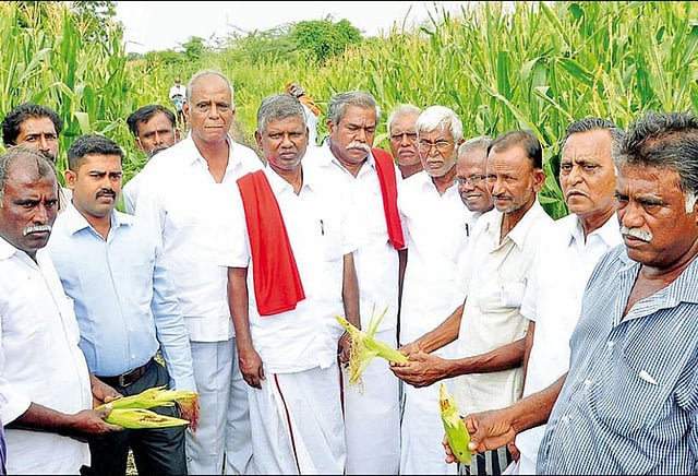 இந்த நிலையில் தமிழ்நாடு விவசாய சங்கத்தின் சார்பில் இந்திய கம்யூனிஸ்டு கட்சியின் மாவட்ட செயலாளர் முன்னாள் எம்.பி. லிங்கம் தலைமையில் அமைக்கப்பட்ட குழுவினர் மாவட்டம் முழுவதும் பாதிக்கப்பட்ட மக்காச்சோள பயிர்களை பார்வையிட்டனர். இக்குழுவில் முன்னாள் எம்.எல்.ஏ. ராமசாமி, விவசாய சங்க மாவட்ட தலைவர் சீனிவாசன், மாநிலக்குழு உறுப்பினர் வக்கீல் சீனிவாசன் உள்ளிட்டவர்கள் இடம் பெற்று இருந்தனர்.