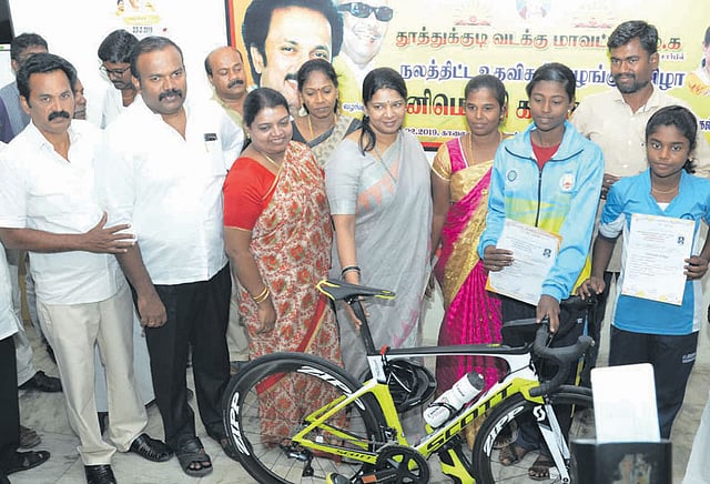 சிறப்பு அழைப்பாளராக கனிமொழி எம்.பி. கலந்து கொண்டார். கீழமுடிமண்ணை சேர்ந்த பள்ளி மாணவி ஸ்ரீமதி மாவட்ட, மாநில அளவிலான சைக்கிள் போட்டியில் கலந்து கொண்டு பல சாதனைகளை படைத்து உள்ளார். அவர் சர்வதேச போட்டியில் கலந்து கொள்ள சைக்கிள் தேவைப்படுவதாக கிராம சபை கூட்டத்தில் கோரிக்கை வைத்தார். அதன்படி கனிமொழி எம்.பி., மாணவி ஸ்ரீமதிக்கு சுமார் ரூ.5 லட்சம் மதிப்புள்ள சைக்கிளை வழங்கி வாழ்த்து தெரிவித்தார். அதேபோல் கடந்த ஆண்டு நாக்பூரில் நடந்த தேசிய அளவிலான ஸ்கேட்டிங் போட்டியில் வெற்றி பெற்ற தூத்துக்குடியை சேர்ந்த 6 வீரர்கள் கனிமொழி எம்.பி.யை நேரில் சந்தித்து வாழ்த்து பெற்றனர்.