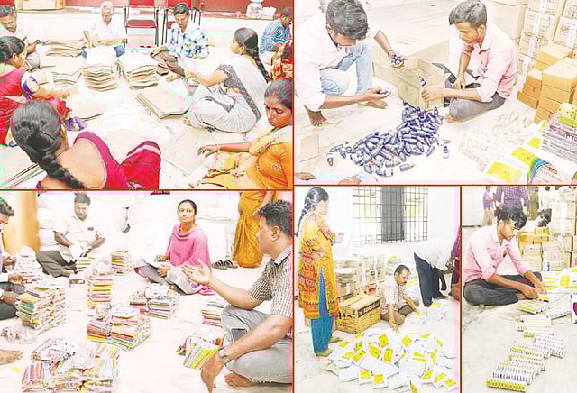 மாவட்டத்தில் 9 சட்டமன்ற தொகுதிகளில் வாக்குச்சாவடி மையங்களில் பயன்படுத்தக் கூடிய பொருட்கள் கடந்த சில நாட்களுக்கு முன்பு கலெக்டர் அலுவலகம் வந்தது. அவற்றை அந்தந்த தொகுதி தேர்தல் அலுவலர் அலுவலகங்களுக்கு அனுப்பி வைக்கும் பணி நடந்து வருகிறது. எழுது பொருட்கள், வாக்காளர்கள் கையில் வைக்கும் மை, படிவ உறைகள் உள்ளிட்டவை தனித்தனியாக பிரித்து அனுப்பும் பணி தீவிரமாக நடந்து வருகிறது.