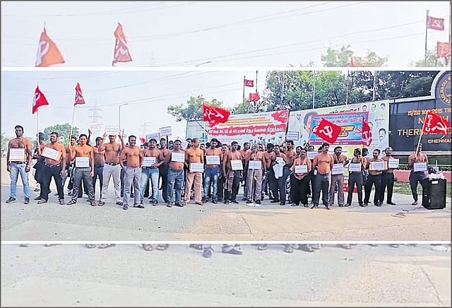கோரிக்கைகளை வலியுறுத்தி வடசென்னை அனல் மின்நிலைய ஒப்பந்த ஊழியர்கள் அரை நிர்வாண போராட்டத்தில் ஈடுபட்டனர்.