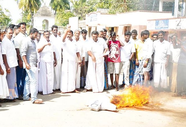 இதேபோல் திருத்துறைப்பூண்டி காமராஜர் சிலை அருகே தி.க. சார்பில் ஆர்ப்பாட்டம் நடந்தது. ஆர்ப்பாட்டத்துக்கு தி.க. மாவட்ட செயலாளர் பொன்முடி தலைமை தாங்கினார். தி.மு.க. நகர செயலாளர் பாண்டியன், டி.டி.வி.தினகரன் அணி நகர செயலாளர் தாஜீதீன், இந்திய கம்யூனிஸ்டு கட்சி நகர செயலாளர் முருகேசன், மார்க்சிஸ்ட் கம்யூனிஸ்டு கட்சி நகர செயலாளர் ரகுராமன், காங்கிரஸ் கட்சியின் நகர தலைவர் எழிலரசன் உள்பட பலர் கலந்து கொண்டனர்.
