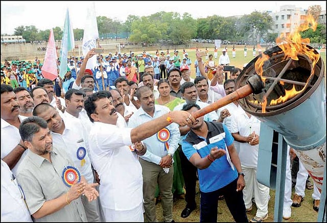 நிகழ்ச்சியில் தமிழக கால்நடை பராமரிப்புத்துறை அமைச்சர் பாலகிருஷ்ணரெட்டி கலந்து கொண்டு தேசிய கொடியை ஏற்றி வைத்து மரியாதை செலுத்தினார். இதைத் தொடர்ந்து தடகள போட்டி வீரர், வீராங்கனைகளின் அணிவகுப்பு மரியாதையை ஏற்றார். பின்னர் அமைச்சர் பாலகிருஷ்ணரெட்டி தீபத்தை ஏற்றி வைத்து தடகள போட்டிகளை தொடங்கி வைத்தார்.