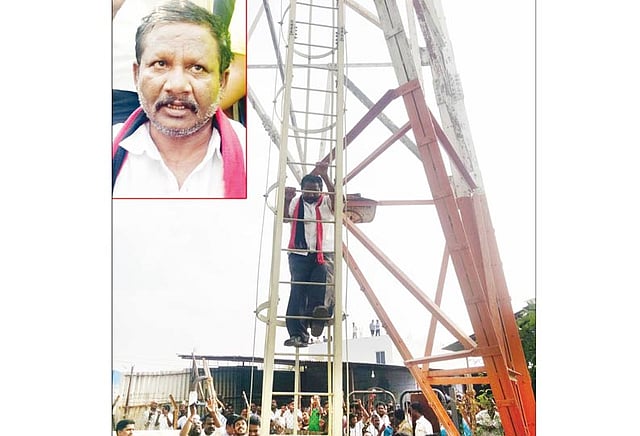 சேலம் மாவட்டம் தாரமங்கலம் அருகே உள்ள கணக்குப்பட்டியை சேர்ந்தவர் கோபால் (வயது 48). இவர் கணக்குப்பட்டி தி.மு.க. கிளை செயலாளராக உள்ளார். இந்த நிலையில் நேற்று மதியம் 2 மணியளவில் திடீரென்று கோபால் தாரமங்கலம் பஸ் நிலையம் பின்புறம் உள்ள 200 அடி உயரமுள்ள தனியார் செல்போன் கோபுரத்தின் மீது ஏறினார். செல்போன் கோபுரத்தின் உச்சிக்கு சென்ற அவர் நீட் தேர்வுக்கு எதிர்ப்பு தெரிவித்து தான் தற்கொலை செய்து கொள்வதாக கோஷமிட்டார். இவரது சத்தத்தை கேட்டு அப்பகுதியில் பொதுமக்கள் திரண்டனர்.