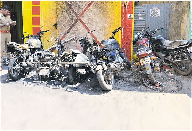 இதைக்கண்டு அதிர்ச்சி அடைந்த அப்பகுதி மக்கள் தண்ணீரை ஊற்றி இரு சக்கர வாகனங்களில் பற்றி எரிந்த தீயை அணைத்தனர். ஆனாலும் 5 இருசக்கர வாகனங்கள் தீயில் எரிந்து சேதம் அடைந்தன. ஒரு இருசக்கர வாகனத்தில் மட்டும் லேசாக தீப்பிடித்து.