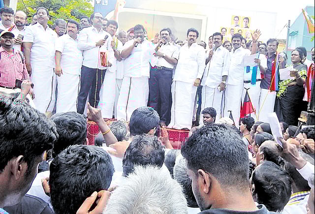 ஆர்ப்பாட்டத்திற்கு திருவள்ளூர் தெற்கு மாவட்ட தி.மு.க. செயலாளர் ஆவடி சா.மு.நாசர் தலைமை தாங்கினார். திருவள்ளூர் எம்.எல்.ஏ. வி.ஜி.ராஜேந்திரன், முன்னாள் எம்.பி. கிருஷ்ணசாமி, மாவட்ட மகளிர் அணி நிர்வாகி சங்கீதா சீனிவாசன், திருவள்ளூர் நகர செயலாளர் சி.சு.ரவிச்சந்திரன், விடுதலை சிறுத்தைகள் கட்சியின் மாநில நிர்வாகிகள் ராஜகுமார், நீலவானத்து நிலவன், பாலசிங்கம், தளபதி சுந்தர் ஆகியோர் முன்னிலை வகித்தனர். சிறப்பு அழைப்பாளராக விடுதலை சிறுத்தைகள் கட்சியின் தலைவர் திருமாவளவன் கலந்து கொண்டு பேசினார்.