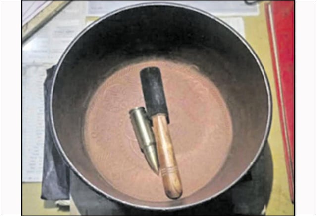 போலீசார் அங்கு சென்று பிளாஸ்டிக் பையை மீட்டு சோதனை நடத்தினர். அப்போது அதற்குள் 9 எம்.எம். துப்பாக்கி தோட்டா இருந்ததை பார்த்து அதிர்ச்சி அடைந்தனர்.