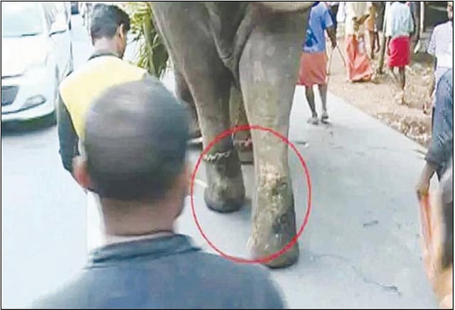 கேரள மாநிலம் காக்கநாடு பகுதியில் பிரசித்தி பெற்ற பகவதி அம்மன் கோவில் உள்ளது. இந்த கோவிலில் திருவிழா நடைபெற்று வருகிறது. விழாவுக்கு திருச்சூரில் இருந்து மகாதேவன் என்ற யானை வரவழைக்கப்பட்டது. யானையின் பின் பகுதியில் உள்ள வலது காலில் ஆழமான புண் இருந்தது. இதை மறைக்க அதன் மீது கருப்பு வண்ணம் பூசப்பட்டிருந்தது. இந்த காலில் தான் பாகன் ஏறி இறங்குவார்.
