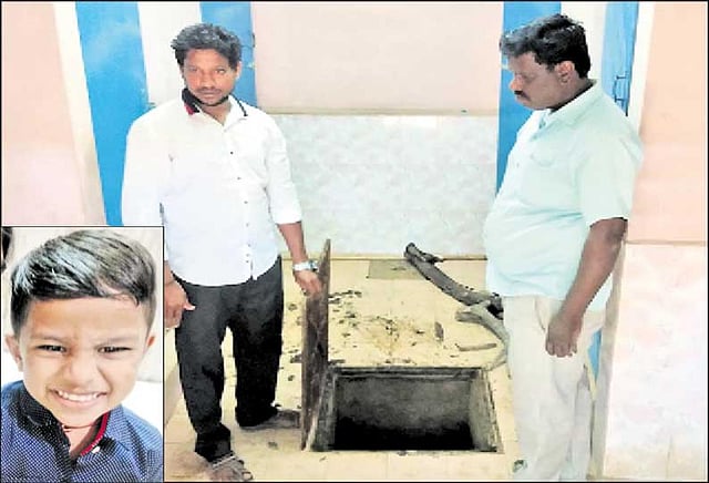 நேற்று காலை வழக்கம்போல் கிருதீஸ்வரன் பள்ளிக்கு சென்றான். பள்ளி வளாகத்தில் கழிவறைக்குள் உள்ள கழிவுநீர் தொட்டியில்(செப்டிக் டேங்க்) அடைப்பு ஏற்பட்டு இருந்தது. அதை சரிசெய்யும் பணியில் பாலாஜி, தரணிபாபு(27) ஆகியோர் ஈடுபட்டு இருந்தனர்.