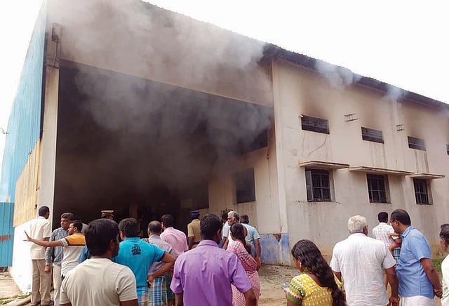 சிறிது நேரத்திற்கு பிறகு கம்பெனியின் உள்ளே இருந்து கரும்புகை வெளிவந்தது. இதைப்பார்த்து அதிர்ச்சி அடைந்த தொழிலாளர்கள் உள்ளே சென்று பார்த்தனர். அங்கு அட்டை பெட்டிகள் தயாரிப்பதற்காக வைக்கப்பட்டு இருந்த அட்டை சுருள்களில் தீ பற்றி எரிந்து கொண்டு இருந்தது. மேலும், அருகில் உள்ள அட்டைகளுக்கும் தீ மளமளவென பரவியது. இதனால் சிறிது நேரத்தில் கம்பெனி முழுவதும் தீ கொழுந்துவிட்டு எரியத்தொடங்கியது.