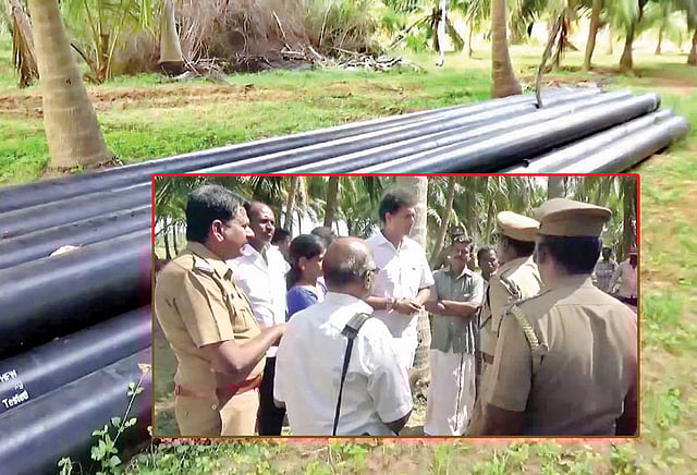 திருவாரூர் மாவட்டம் கோவில்களப்பாலில் இருந்து திருமக்கோட்டை சுழல் மின் உற்பத்தி நிலையத்துக்கு பூமிக்கு அடியில் எரிவாயு கொண்டு செல்லும் வகையில் கோவிந்தநத்தம் கிராமம் வழியாக கெயில் நிறுவனம் சார்பில் கடந்த 2016-ம் ஆண்டு குழாய் பதிக்கும் பணிகள் மேற்கொள்ளப்பட்டது. அப்போது கிராம மக்கள், விளை நிலங்களில் குழாய் பதித்தால் நிலம் பாதிக்கப்படும் என கூறி போராட்டத்தில் ஈடுபட்டு பணிகளை நிறுத்தி வைத்தனர்.