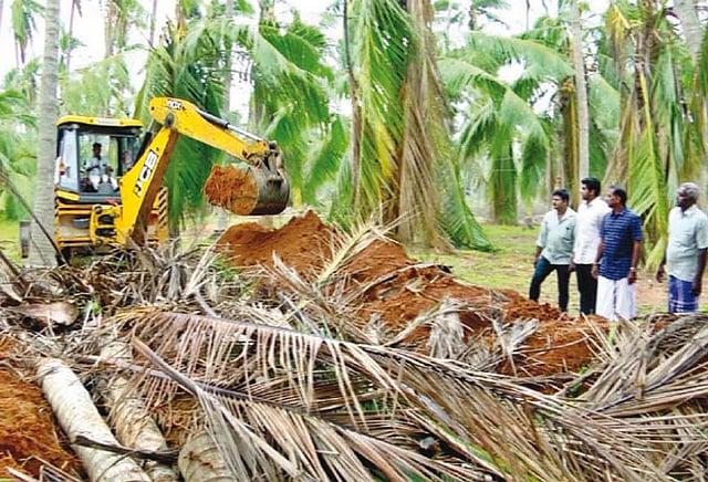 தென்னை மரங்களை அகற்ற அரசின் உதவி கிடைக்காததால், அழுகிய நிலையில் இருக்கும் மரங்களால் தொற்றுநோய் ஏற்படாமல் இருக்க அவற்றை சில விவசாயிகள் வயலில் தீயிட்டு அழித்துவருகின்றனர். இந்தநிலையில் பட்டுக்கோட்டையை அடுத்துள்ள நம்பி வயல் பகுதி விவசாயிகள், பிள்ளையை போல் வளர்த்த, சாய்ந்து விழுந்த தென்னை மரங்களை எரிக்க மனமில்லாமல் வேதனையுடன் வயல்களிலேயே அவற்றை துண்டு துண்டுகளாக வெட்டி பொக்லின் எந்திரம் மூலமாக புதைத்து வருகின்றனர்.