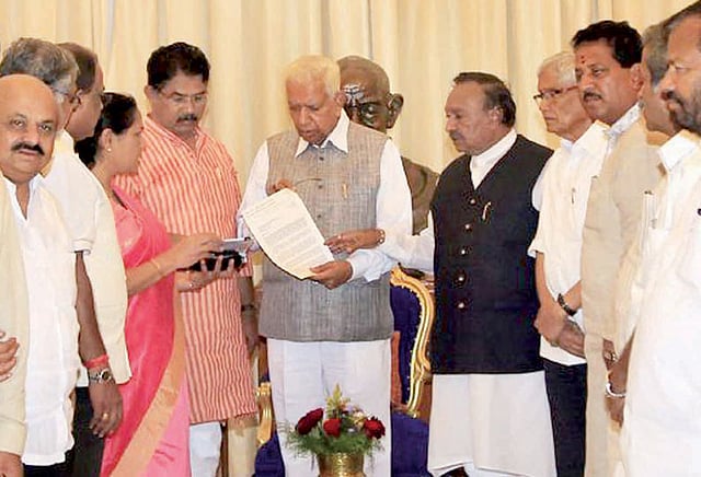 மகாத்மா காந்தி சிலை முன்பு இருந்து சட்டசபை எதிர்க்கட்சி துணைத்தலைவர் ஆர்.அசோக், மேல்-சபை எதிர்க்கட்சி தலைவர் ஈசுவரப்பா, ஷோபா எம்.பி. உள்பட எம்.பி.க்கள், எம்.எல்.ஏ.-எம்.எல்.சி.க்கள் ஊர்வலமாக ராஜ்பவனுக்கு சென்றனர். அங்கு கவர்னர் வஜூபாய் வாலாவை நேரில் சந்தித்து ஒரு மனுவை கொடுத்தனர்.