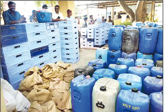 அங்கு கேன்கள், பாட்டில்கள், பெட்டிகள் என 4,600 லிட்டர் அளவிலான சாராயம் பதுக்கி வைத்திருந்தது கண்டுபிடிக்கப்பட்டது. இதன் மதிப்பு சுமார் ரூ.8 லட்சம் இருக்கும் என்று போலீசார் தெரிவித்தனர்.