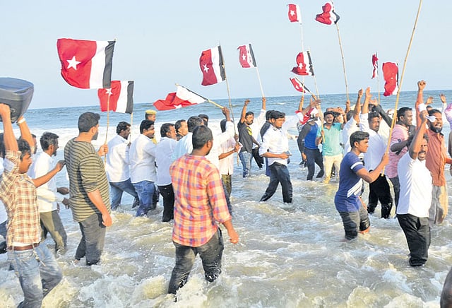 பின்னர் மனிதநேய ஜனநாயக கட்சியினர் கடலில் இறங்கி ஆர்ப்பாட்டம் செய்தனர். அப்போது காவிரி மேலாண்மை வாரியத்தை உடனடியாக அமைக்காவிட்டால் வருகிற 10-ந்தேதி சென்னையில் நடைபெற உள்ள ஐ.பி.எல். போட்டிகளை நடத்த விடமாட்டோம் என்று அவர்கள் கோஷமிட்டனர்.