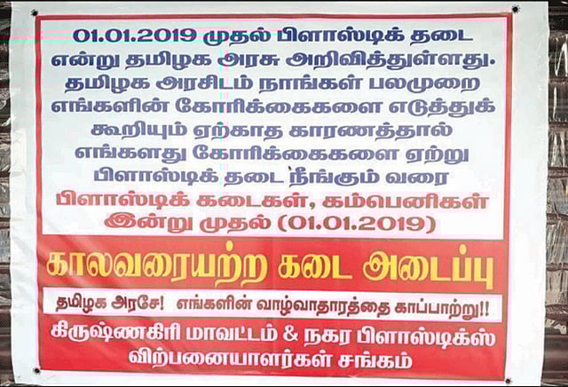 இதற்கு கண்டனம் தெரிவித்து கிருஷ்ணகிரியில் பிளாஸ்டிக் விற்பனையாளர்கள் கடையடைப்பு போராட்டத்தில் ஈடுபட்டுள்ளனர். மேலும் கடைகளின் முன்பு கோரிக்கைகளை நிறைவேற்றும் வரை காலவரையற்ற போராட்டம் என அறிவிப்பு பேனர்களும் வைத்துள்ளனர். இது குறித்து பிளாஸ்டிக் விற்பனையாளர்கள் சங்க நிர்வாகிகள் கூறுகையில், கிருஷ்ணகிரி நகரத்தில் கடந்த 20 ஆண்டுகளுக்கு மேலாக பிளாஸ்டிக் கவர் மற்றும் மூலப்பொருட்கள் விற்பனை செய்து வருகிறோம். தற்போது தமிழக அரசால் கடந்த 1-ந் தேதி முதல் தடை செய்யப்பட்ட பிளாஸ்டிக் கேரி பேக்குகளை நாங்கள் விற்பனை செய்வதில்லை.