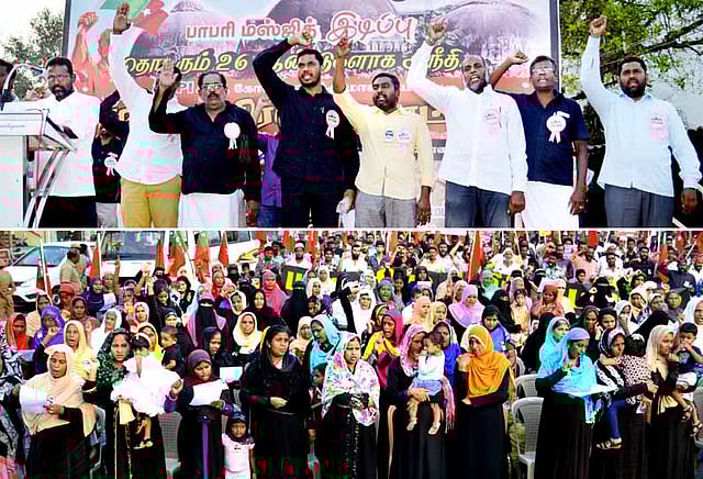 தமிழ்நாடு முஸ்லிம் முன்னேற்ற கழக மாவட்ட பொருளாளர் ஜாபர்சாதிக், தி.மு.க. மாவட்ட செயலாளர் சி.ஆர்.ராமச்சந்திரன், காங்கிரஸ் கட்சி சார்பில் ரங்கராஜன், விடுதலை சிறுத்தைகள் கட்சி சார்பில் குடியரசு, ம.தி.மு.க. சார்பில் இக்பால், தந்தை பெரியார் திராவிடர் கழகம் சார்பில் சந்திரசேகர், இந்திய கம்யூனிஸ்டு கட்சி சார்பில் சக்திவேல் குமரன், மனிதநேய மக்கள் கட்சி சார்பில் அப்துல் ஹக்கீம், அஜ்மீர்கான் மற்றும் பலர் பேசினார்கள். ஆர்ப்பாட்டத்தில் த.மு.மு.க.வினர், பெண்கள் திரளாக கலந்து கொண்டனர். முடிவில் சிராஜ்தீன் நன்றி கூறினார்.
