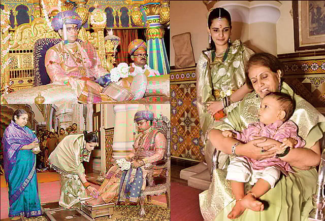 அதன்பின்னர் காலை 10 மணி அளவில் இளவரசர் யதுவீர் கிருஷ்ணதத்த சாமராஜ உடையார், தங்கம், வைரம், ரத்தினங்களால் அலங்கரிக்கப்பட்ட சிம்மாசனத்துக்கு சிறப்பு பூஜை செய்தார். அதன்பின்னர் அரண்மனை புரோகிதர்கள் யதுவீருக்கு பாத பூஜை செய்தனர். யதுவீரின் மனைவி திரிஷிகா குமாரியும் யதுவீர் காலில் மலர்களை தூவி பாத பூஜை செய்தார். அதன்பின்னர் இளவரசர் யதுவீர் ராஜ உடை அணிந்து அரண்மனை காவலர்கள் பாராட்டு கோஷங்கள் முழுங்க தர்பார் ஹாலுக்கு வந்தார்.