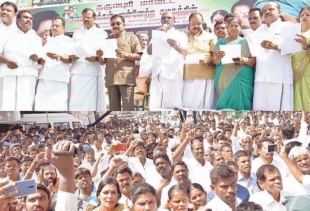 இந்த ஆர்ப்பாட்டத்தில் டி.டி.வி.தினகரன் எம்.எல்.ஏ. தலைமையில் நிர்வாகிகள், தொண்டர்கள் கோரிக்கைகளை வலியுறுத்தியும், இந்த திட்டத்திற்கு நிதி ஒதுக்கீடு செய்யாத தமிழக அரசை கண்டித்தும் கோஷங்கள் எழுப்பினார்கள்.