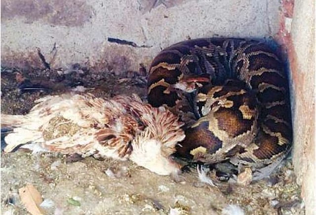 மேலும் அங்கு ஒரு பெரிய மலைப்பாம்பு சுருண்ட நிலையில் இருப்பதை கண்டு அதிர்ச்சி அடைந்தார். அந்த மலைப்பாம்பு ஏற்கனவே 2 கோழிகளை கொன்று விழுங்கிய நிலையில் கிடந்தது. உடனே, அவர் பதறியடித்தபடி தனது கணவர் தமிழ்ராஜிடம் கூறினார். 3-வது கோழியை கொன்ற மலைப்பாம்பு விழுங்க முடியாமல் திணறியது.