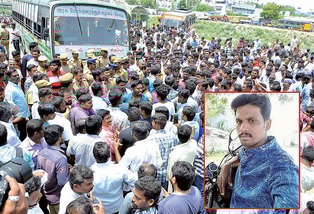 இந்த விபத்தை நேரில் பார்த்த பொதுமக்களும், தகவல் அறிந்து வந்த கார்த்திக்கின் உறவினர்களும் விபத்தை ஏற்படுத்திய அரசு பஸ்சை ஓட்டி வந்த டிரைவர் முருகன் குடிபோதையில் பஸ்சை ஓட்டிவந்து விபத்தை ஏற்படுத்தியதாக கூறி, அவரை தாக்க முயன்றனர். இதனால் அங்கு பரபரப்பு ஏற்பட்டது.