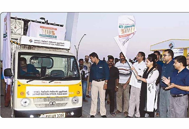 அதைத்தொடர்ந்து பொதுமக்களிடம் 100 சதவீத கட்டாய வாக்குப்பதிவை வலியுறுத்தும் விதமாக காணொலி விழிப்புணர்வு பிரசார வாகனத்தை புதுவை சட்டம்-ஒழுங்கு சீனியர் போலீஸ் சூப்பிரண்டு அபூர்வ குப்தா கொடியசைத்து தொடங்கிவைத்தார்.
