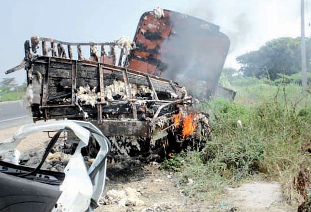 வெள்ளகோவில் அருகே நேற்று முன்தினம் காலை காரும், பஞ்சு ஏற்றி வந்த லாரியும் நேருக்கு நேர் மோதிக்கொண்ட விபத்தில் காரில் பயணம் செய்த 3 பேர் பலியானார்கள். 6 பேர் பலத்த காயம் அடைந்தனர். காயம் அடைந்த அனைவரும் கோவை அரசு ஆஸ்பத்திரியில் சிகிச்சை பெற்று வருகிறார்கள். விபத்தின் போது காரின் டீசல் டேங்க் வெடித்து, டீசல் சிதறியதில் பஞ்சு லாரி தீப்பிடித்து எரிந்தது. உடனே வெள்ளகோவில் தீயணைப்பு படை வீரர்களும் போலீசாரும் விரைந்து சென்று தீயை அணைத்தனர். அதன்பின்னர் லாரியையும், காரையும் சாலையின் ஓரமாக தள்ளி விட்டு சென்று விட்டனர்.