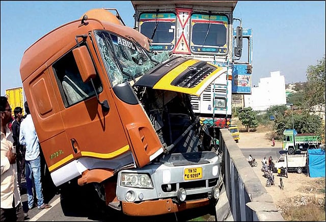 புனேவில் இருந்து புது கார்களை ஏற்றிக் கொண்டு கன்டெய்னர் லாரி ஒன்று சேலம்-கோவை தேசிய நெடுஞ்சாலையில் செங்கப்பள்ளி வழியாக கேரளா நோக்கி சென்று கொண்டிருந்தது. இந்த லாரிக்கு பின்னால் மேட்டூரில் இருந்து சாம்பல் பாரம் ஏற்றிக்கொண்டு மற்றொரு லாரி கோவை நோக்கி வந்து கொண்டிருந்தது.